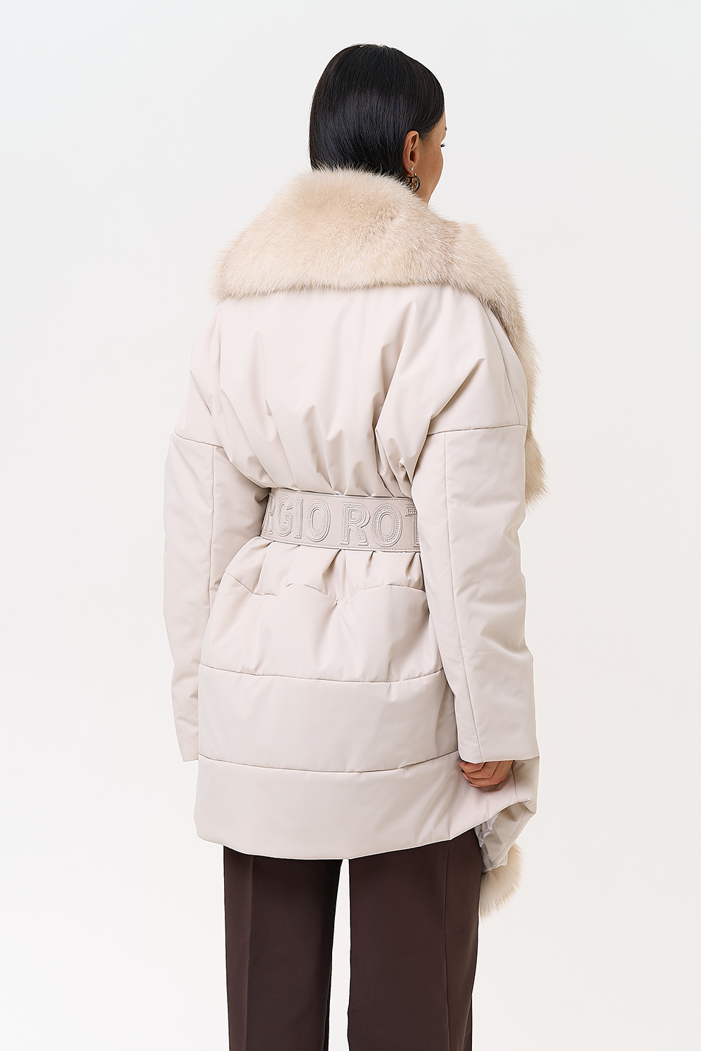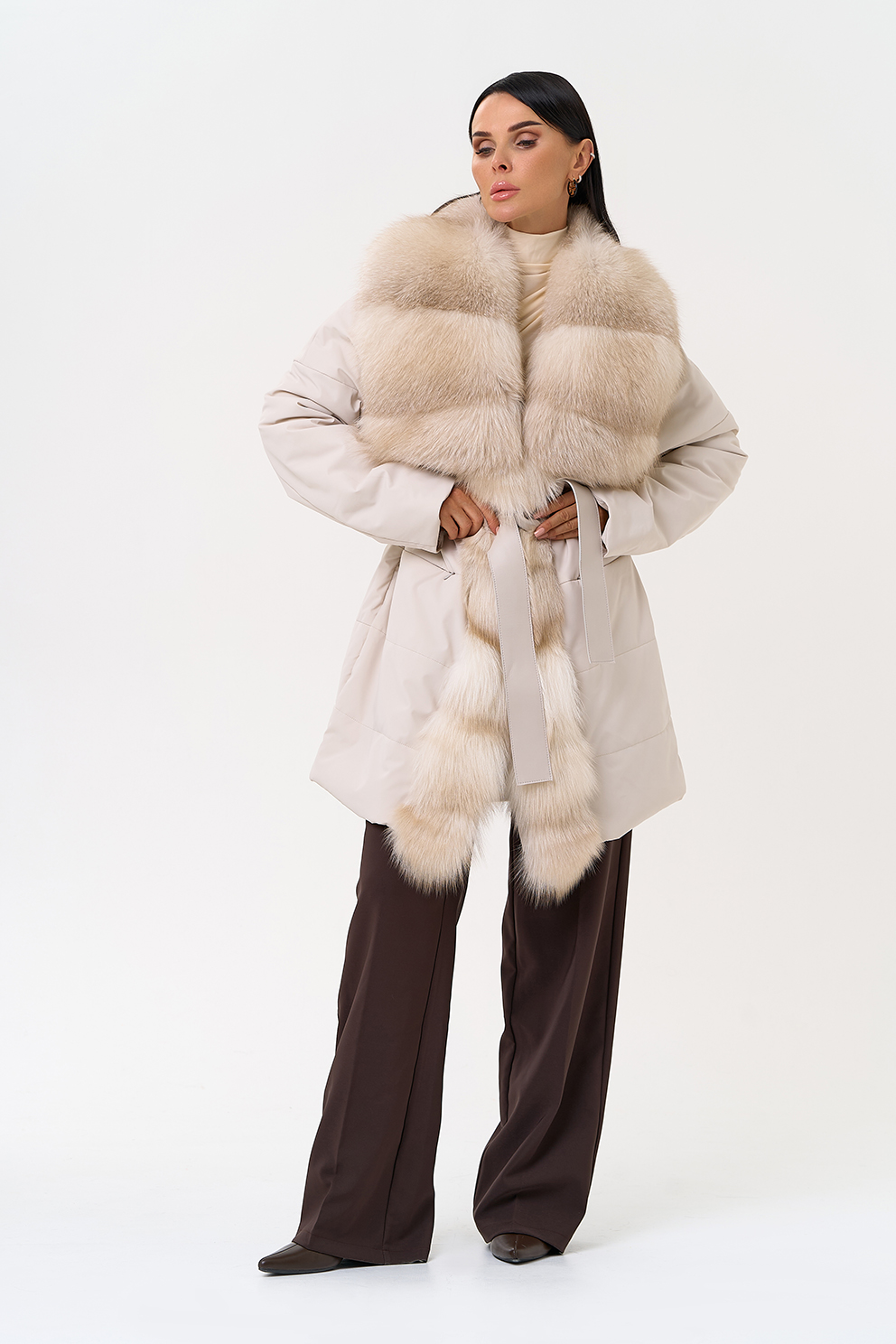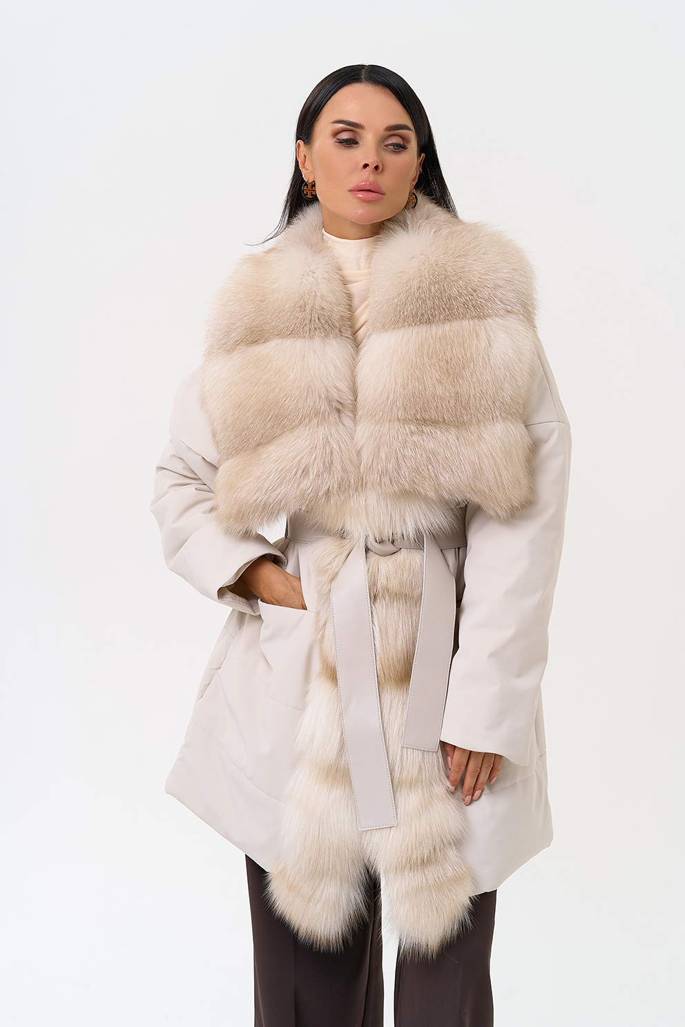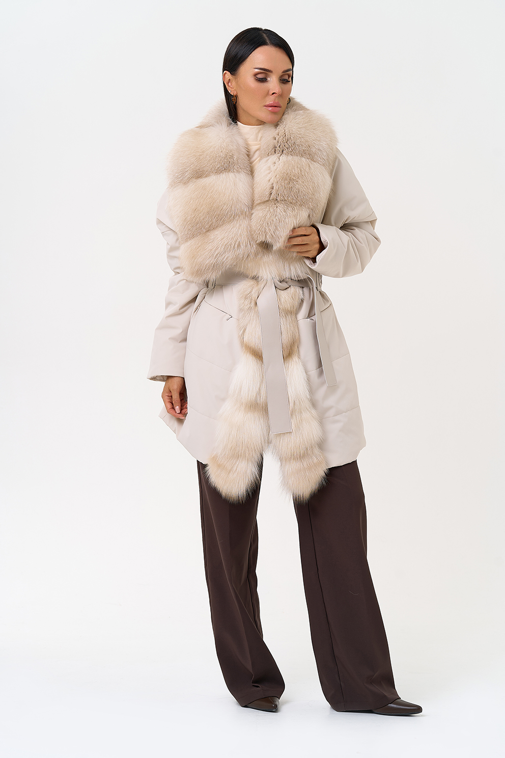 Вид застежки - кнопки, брендированный пояс из натуральной кожи