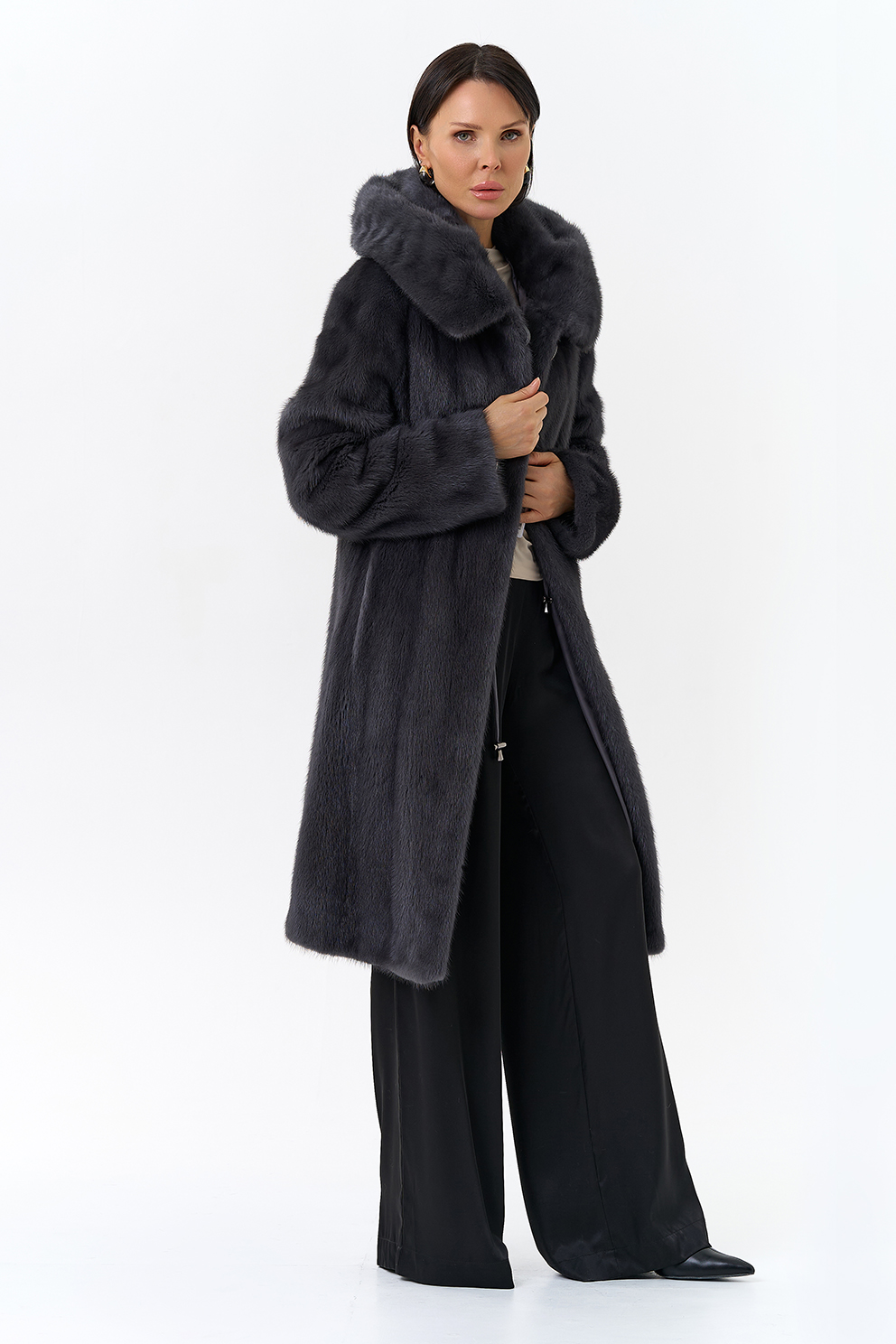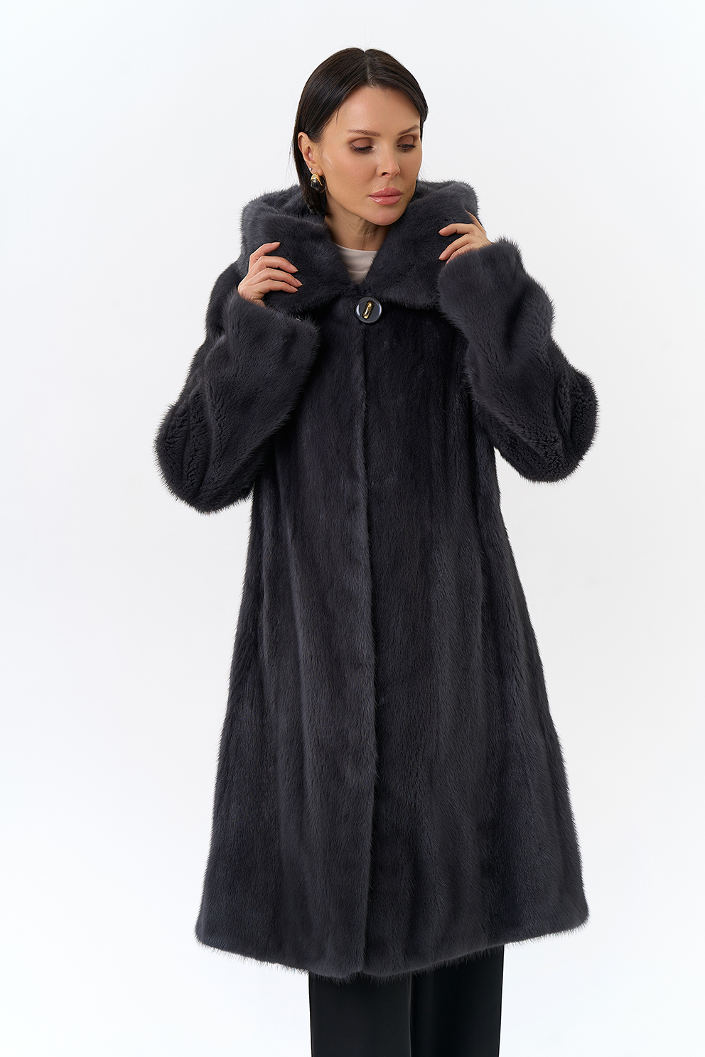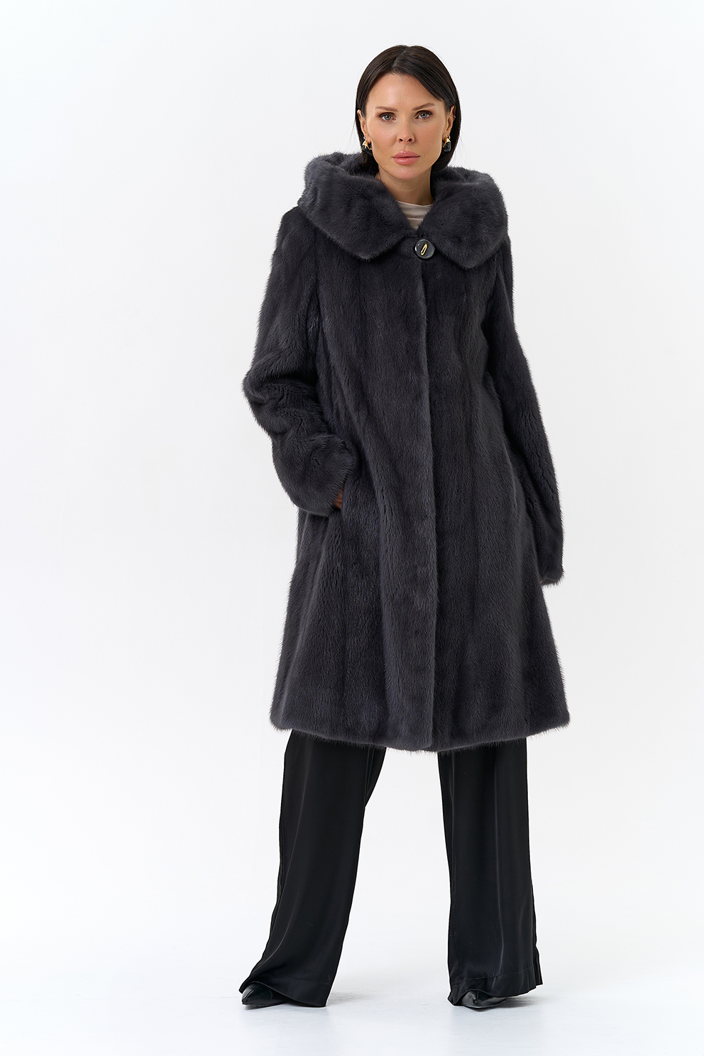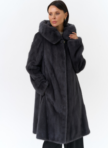 Норковая шуба годе/балетка в роспуск с капюшоном в роскошном цвете графит - это то изделие, в котором и девушка, и более взрослая леди почувствует себя особенно привлекательной. Этот фасон универсален, потому что позволяет экспериментировать с образами благодаря обуви и аксессуарам. Изделие дополнено пуговицами и шубными крючками. Представлен большой размерный ряд от 40 до 52 размера.