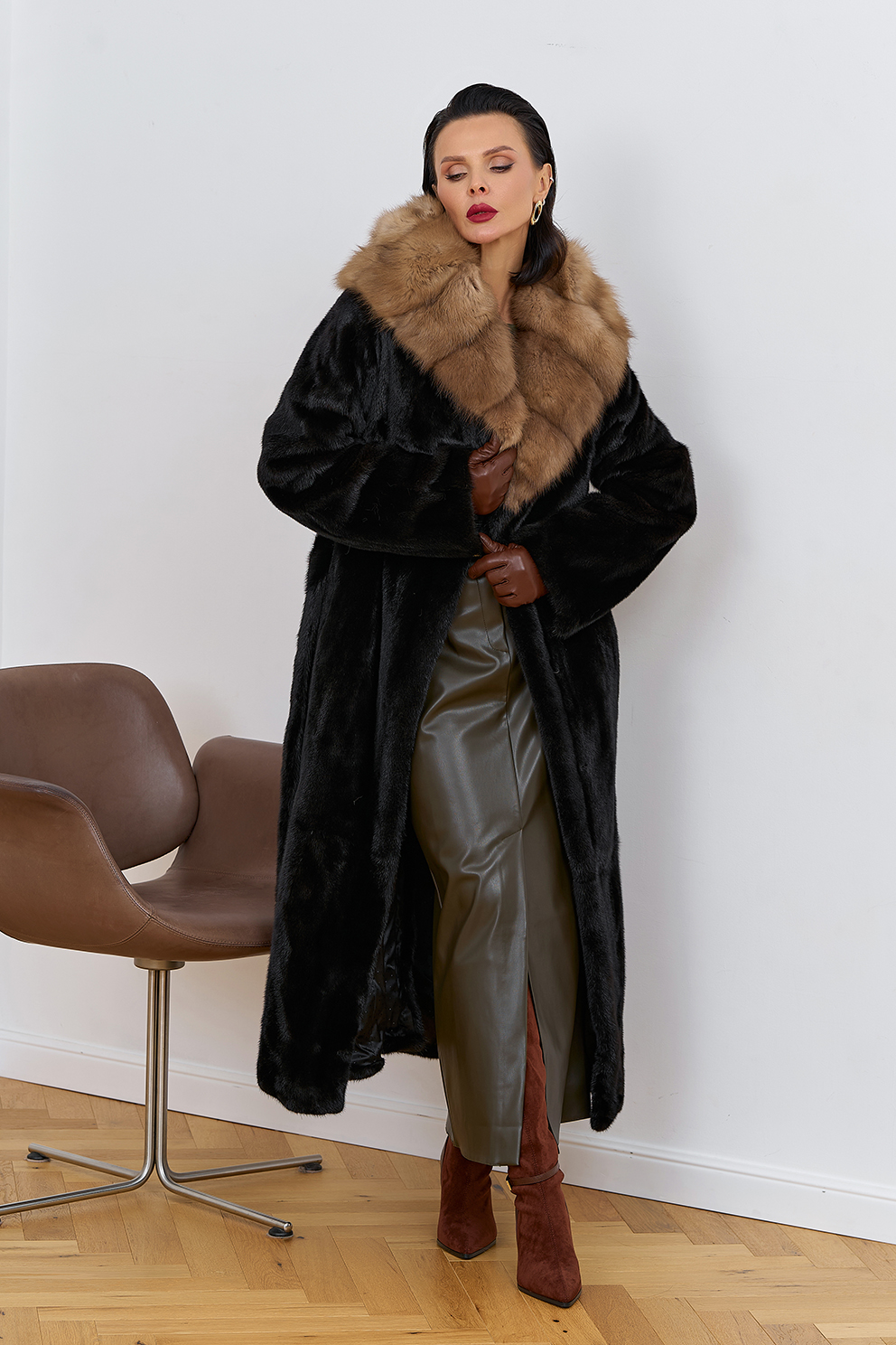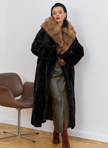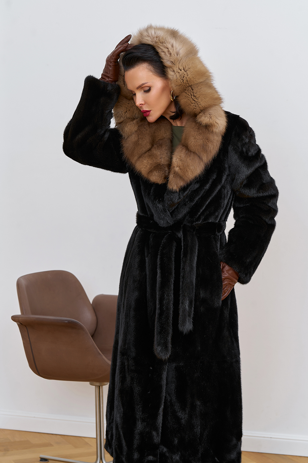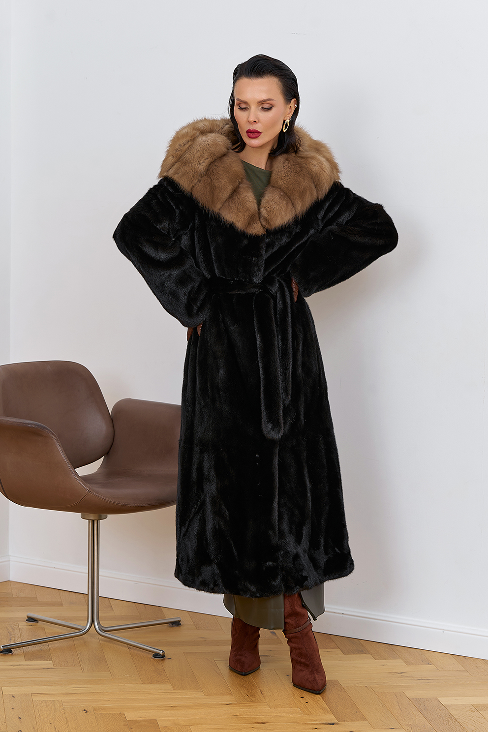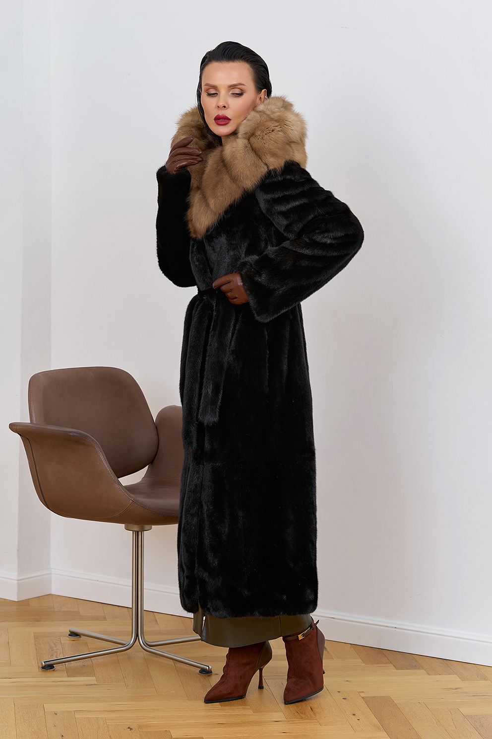 Шуба из меха норки с капюшоном из меха куницы (чёрный)