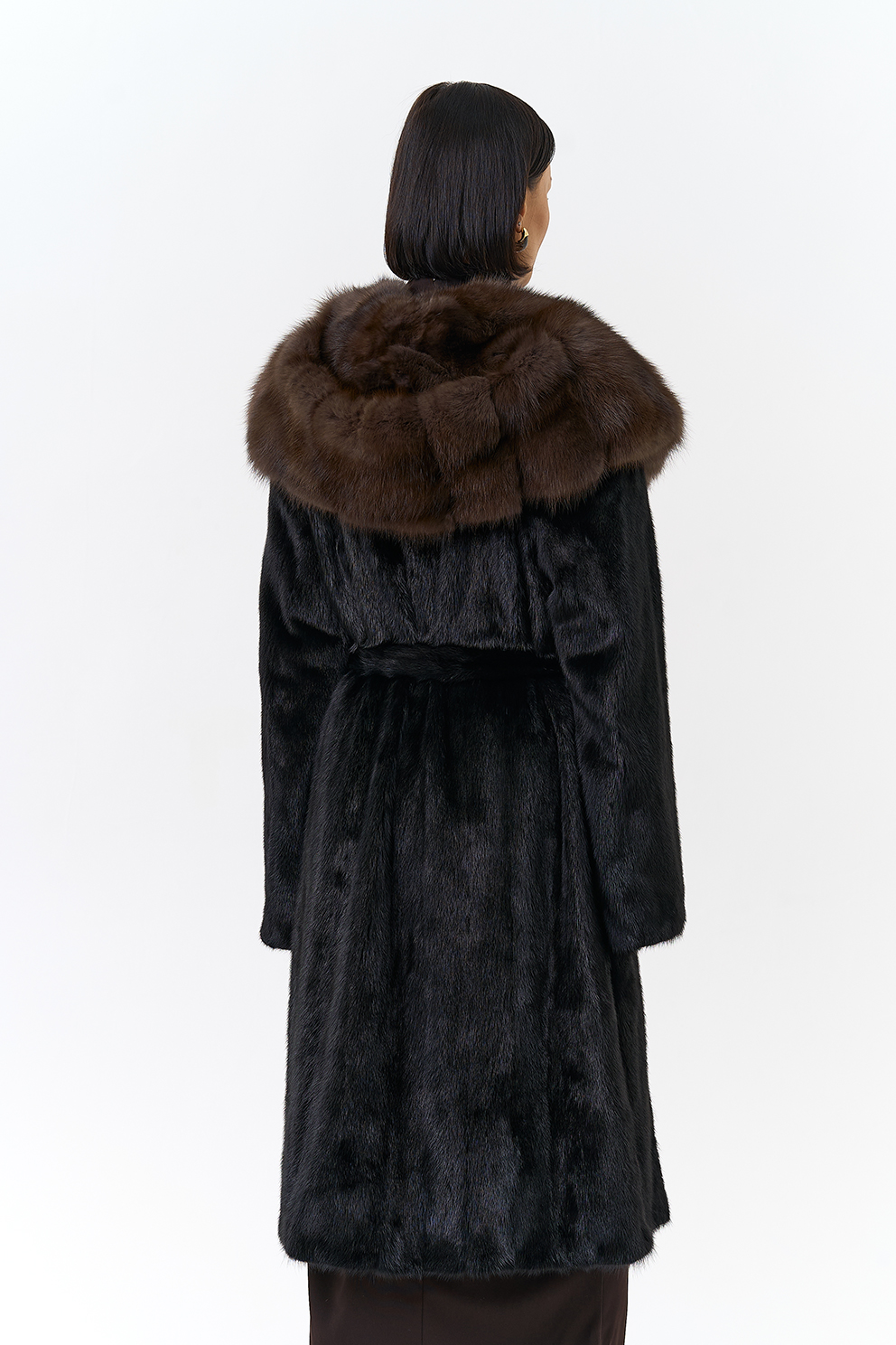 женщины. Капюшон выполнен с отделкой из куницы, что добавляет шубе роскоши.